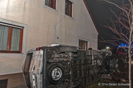 Um 17:48h wurde die Freiwillige Feuerwehr Tattendorf über die Feuerwehr-Bezirksalarmzentrale (BAZ) Baden zu dem Verkehrsunfall alarmiert. Auch ein Großaufgebot von Rettungskräften war in der Zwischenzeit unterwegs zum Unfallort. Für die Bergung des Transportes lies der Feuerwehreinsatzleiter das Wechselladefahrzeug-Kran der FF Traiskirchen-Stadt nachalarmieren. Bis zum Eintreffen dieses, wurde seitens der Florianis Sicherungsarbeiten durchgeführt und die Einsatzstelle ausgeleuchtet. Mit dem Ladekran konnte dann das Unfallfahrzeug direkt aus dem Garten gehoben und auf der Fahrbahn abgelegt werden. Dort wurde es wieder auf die Räder gestellt und einem privaten Abschleppunternehmen übergeben. Am Fahrzeug aber auch am Grundstück entstand erheblicher Sachschaden. Der Feuerwehreinsatz konnte nach ca. 2,5 Std. beendet werden.