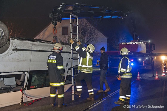 Um 17:48h wurde die Freiwillige Feuerwehr Tattendorf über die Feuerwehr-Bezirksalarmzentrale (BAZ) Baden zu dem Verkehrsunfall alarmiert. Auch ein Großaufgebot von Rettungskräften war in der Zwischenzeit unterwegs zum Unfallort. Für die Bergung des Transportes lies der Feuerwehreinsatzleiter das Wechselladefahrzeug-Kran der FF Traiskirchen-Stadt nachalarmieren. Bis zum Eintreffen dieses, wurde seitens der Florianis Sicherungsarbeiten durchgeführt und die Einsatzstelle ausgeleuchtet. Mit dem Ladekran konnte dann das Unfallfahrzeug direkt aus dem Garten gehoben und auf der Fahrbahn abgelegt werden. Dort wurde es wieder auf die Räder gestellt und einem privaten Abschleppunternehmen übergeben. Am Fahrzeug aber auch am Grundstück entstand erheblicher Sachschaden. Der Feuerwehreinsatz konnte nach ca. 2,5 Std. beendet werden.