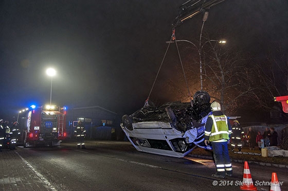 Um 17:48h wurde die Freiwillige Feuerwehr Tattendorf über die Feuerwehr-Bezirksalarmzentrale (BAZ) Baden zu dem Verkehrsunfall alarmiert. Auch ein Großaufgebot von Rettungskräften war in der Zwischenzeit unterwegs zum Unfallort. Für die Bergung des Transportes lies der Feuerwehreinsatzleiter das Wechselladefahrzeug-Kran der FF Traiskirchen-Stadt nachalarmieren. Bis zum Eintreffen dieses, wurde seitens der Florianis Sicherungsarbeiten durchgeführt und die Einsatzstelle ausgeleuchtet. Mit dem Ladekran konnte dann das Unfallfahrzeug direkt aus dem Garten gehoben und auf der Fahrbahn abgelegt werden. Dort wurde es wieder auf die Räder gestellt und einem privaten Abschleppunternehmen übergeben. Am Fahrzeug aber auch am Grundstück entstand erheblicher Sachschaden. Der Feuerwehreinsatz konnte nach ca. 2,5 Std. beendet werden.