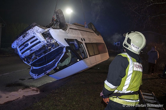 Um 17:48h wurde die Freiwillige Feuerwehr Tattendorf über die Feuerwehr-Bezirksalarmzentrale (BAZ) Baden zu dem Verkehrsunfall alarmiert. Auch ein Großaufgebot von Rettungskräften war in der Zwischenzeit unterwegs zum Unfallort. Für die Bergung des Transportes lies der Feuerwehreinsatzleiter das Wechselladefahrzeug-Kran der FF Traiskirchen-Stadt nachalarmieren. Bis zum Eintreffen dieses, wurde seitens der Florianis Sicherungsarbeiten durchgeführt und die Einsatzstelle ausgeleuchtet. Mit dem Ladekran konnte dann das Unfallfahrzeug direkt aus dem Garten gehoben und auf der Fahrbahn abgelegt werden. Dort wurde es wieder auf die Räder gestellt und einem privaten Abschleppunternehmen übergeben. Am Fahrzeug aber auch am Grundstück entstand erheblicher Sachschaden. Der Feuerwehreinsatz konnte nach ca. 2,5 Std. beendet werden.
