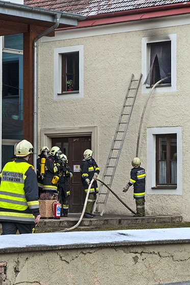 Als die ersten Feuerwehreinsatzkräfte der FF Heiligenkreuz unter der Führung von Feuerwehrkommandant Christof Schöny nur kurze Zeit später am Einsatzort eintrafen, wurde sie bereits vom Brandschutzbeauftragen erwartet und eingewiesen. Aus unbekannter Ursache brach ein Brand in einem Schlafraum eines Studenten im 1. Obergeschoß des „Leopoldinum" aus. Dem Feuerwehreinsatzleiter konnte auch mitgeteilt werden, dass alle Bewohner bereits evakuiert sind. Umgehend erkundete der Feuerwehreinsatzleiter Oberbrandinspektor (OBI) Christof Schöny die Lage und stellte bereits eine starke Verrauchung im 1ten Obergeschoß fest. Umgehend wurde ein Atemschutztrupp zur ersten Brandbekämpfung mit Kleinlöschgeräten ins Gebäude entsendet, bis eine Löschleitung in der Zwischenzeit aufgebaut war. Rasch konnte der Atemschutztrupp (FF Heiligenkreuz) den Brandherd in einem Studenten-Schlafzimmer lokalisieren und den Brand unter Kontrolle bringen. Ein weiterer Atemschutztrupp (FF Alland) wurde zum Durchsuchen aller Räumlichkeiten ins 1te Obergeschoß entsendet.
