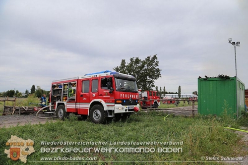 Das benötigte Löschwasser musste neben den alarmierten Tanklöschfahrzeugen auch mittels Zubringerleitungen aus den ca. 100m entfernen Wr.Neustädter Kanal gefördert werden. Der aufkommende Wind begünstigte die rasante Ausbreitung des Brandes auf alle Objekte. Starke Rauchentwicklung erschwerte ebenfalls die Löscharbeiten.