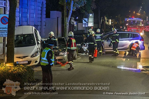 Gegen ca. 23:45 Uhr wurde die örtlich zuständige Freiwillige Feuerwehr Baden Weikersdorf über die Feuerwehr-Bezirksalarmzentrale Baden zu dem Verkehrsunfall alarmiert. Für die Bergung des Pkws, der auf ein anderes geparktes Fahrzeug geschleudert wurde, forderte der Feuerwehreinsatzleiter das Wechselladefahrzeug Kran der FF Baden-Stadt nach. In der Zwischenzeit wurde mit den Aufräumarbeiten und Bergung des Pkws des Unfalllenkers begonnen, sowie auslaufende Betriebsmittel mussten gebunden werden. Die beteiligten Fahrzeuge wurden erheblich beschädigt bzw. entstand an einigen Fahrzeugen Totalschaden.