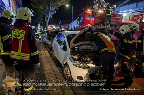 Gegen ca. 23:45 Uhr wurde die örtlich zuständige Freiwillige Feuerwehr Baden Weikersdorf über die Feuerwehr-Bezirksalarmzentrale Baden zu dem Verkehrsunfall alarmiert. Für die Bergung des Pkws, der auf ein anderes geparktes Fahrzeug geschleudert wurde, forderte der Feuerwehreinsatzleiter das Wechselladefahrzeug Kran der FF Baden-Stadt nach. In der Zwischenzeit wurde mit den Aufräumarbeiten und Bergung des Pkws des Unfalllenkers begonnen, sowie auslaufende Betriebsmittel mussten gebunden werden. Die beteiligten Fahrzeuge wurden erheblich beschädigt bzw. entstand an einigen Fahrzeugen Totalschaden.