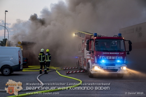 Kurz nach 05 Uhr Morgens wurde der Brand über Notruf 122 bei der Feuerwehr Bezirksalarmzentrale Baden gemeldet. Aufgrund der Örtlichkeit bzw. auch wegen eines in unmittelbarer Nähe angrenzenden weiteren Gewerbebetriebes, wurde sofort die Alarmstufe B3 Geschäftsbrand ausgelöst.